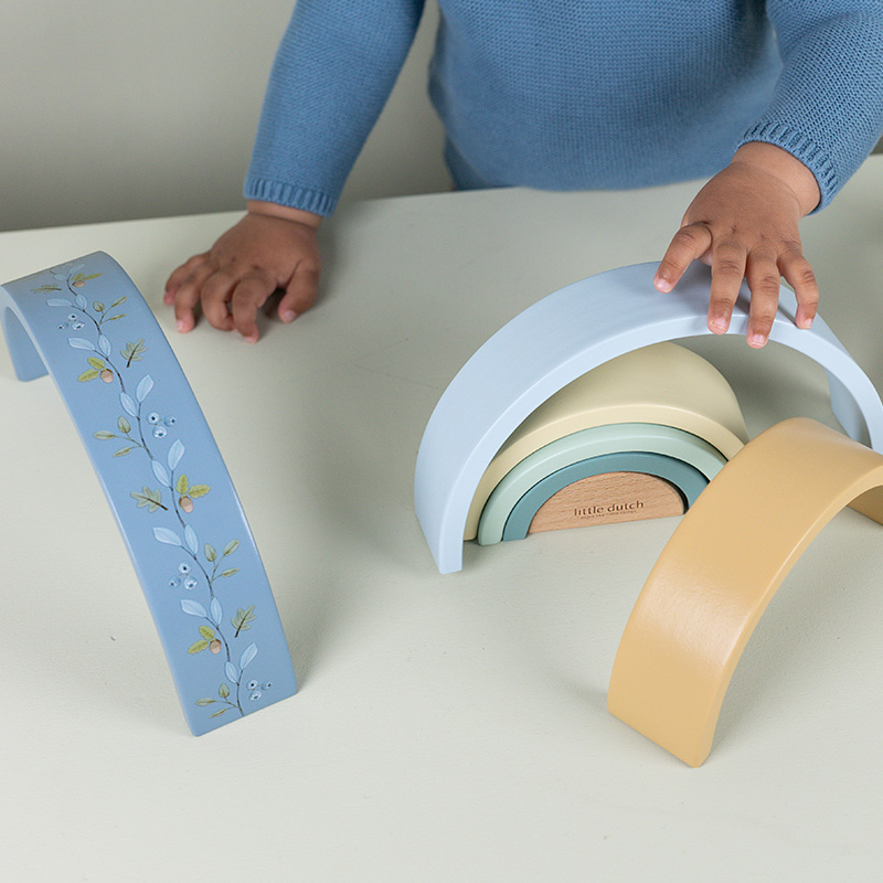 Stapeln, sortieren und bauen! Dieser Regenbogenstapler in Blau-, Gelb- und Grüntönen bietet unendlich viele kreative Möglichkeiten, die über das reine Stapeln zu einem Regenbogen hinausgehen. Bauen Sie Skulpturen, kreieren Sie Tunnel für Züge und Autos, nutzen Sie Ihre Fantasie und Sie werden endlose Ideen finden, um mit den Bögen zu spielen. Der aus Holz gefertigte Regenbogenstapler regt die Fantasie an und fördert die Feinmotorik. Entdecken Sie die Vielseitigkeit dieses Spielzeugs und lassen Sie sich von den unzähligen Möglichkeiten überraschen, wie es genutzt werden kann. Außerdem ist es eine reizvolle Ergänzung für jedes Kinderzimmer.