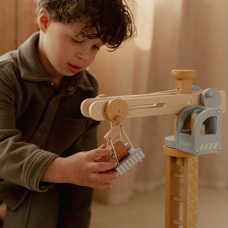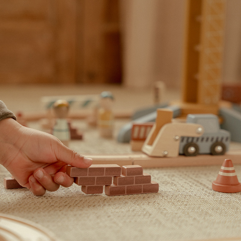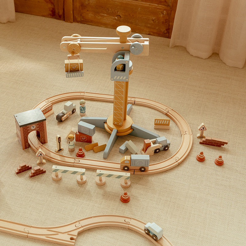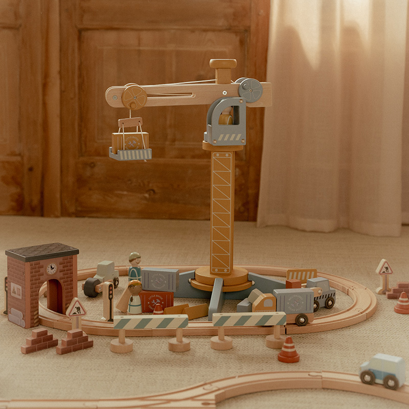 Build and move! This wooden crane lifts loads up and safely lowers them. Includes construction materials, vehicles, construction workers, and traffic signs. Perfect for little builders and easy to combine with the train track XL!
