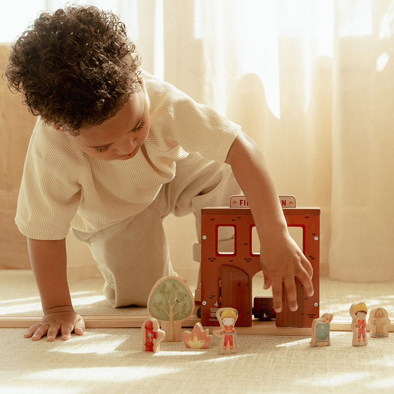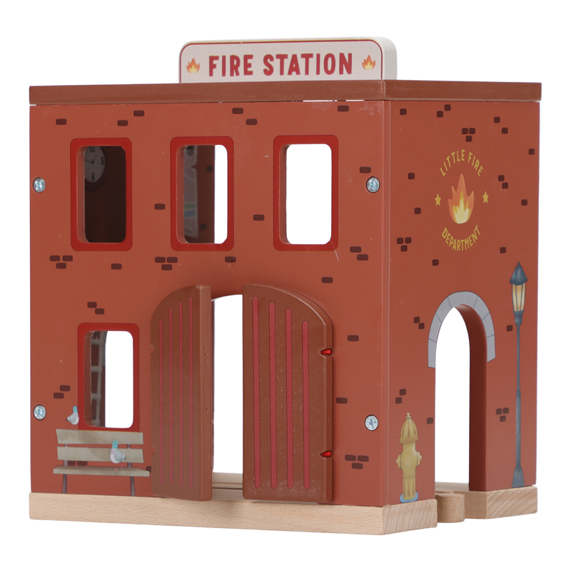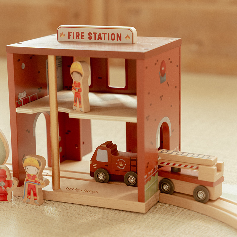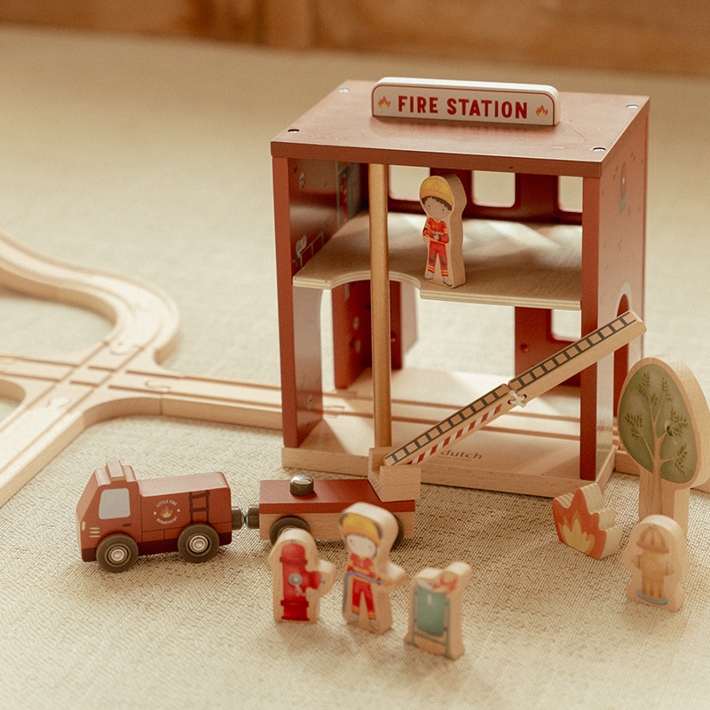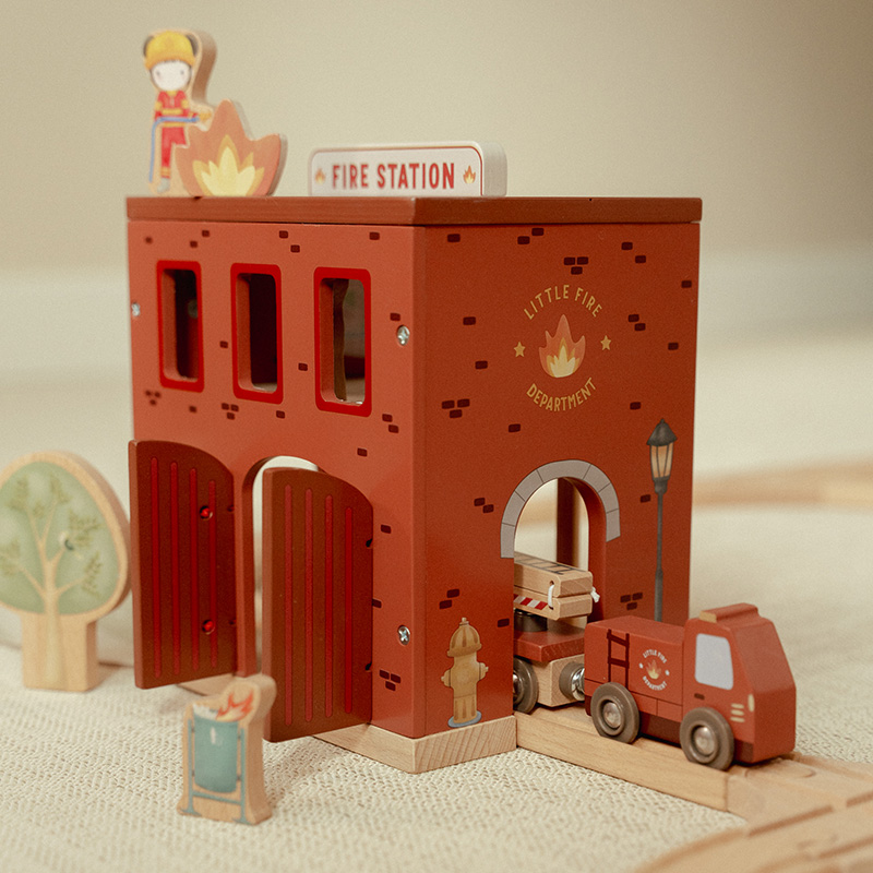 The alarm bell is ringing! This wooden fire station has everything you need for an exciting rescue mission. Open the doors, slide down the fireman’s pole, and jump into the fire truck. Includes firefighters, flames, and a burning trash can. The station's doors can open, allowing for a quick departure. Combine this set with the wooden XL train set for even more adventure. Who will you rescue today?