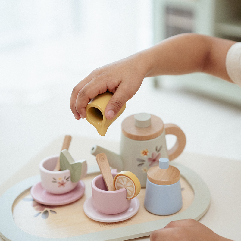A cozy tea moment with friends, stuffed animals, or dolls! With this beautiful wooden tea set, your little one can pour delightful cups of tea. With milk or sugar, or perhaps a slice of lemon or a sprig of mint? The set includes everything needed to recreate a real high tea. Note: only suitable for imaginative tea parties, not for real food or water. Time to enjoy a wonderful cup of tea!