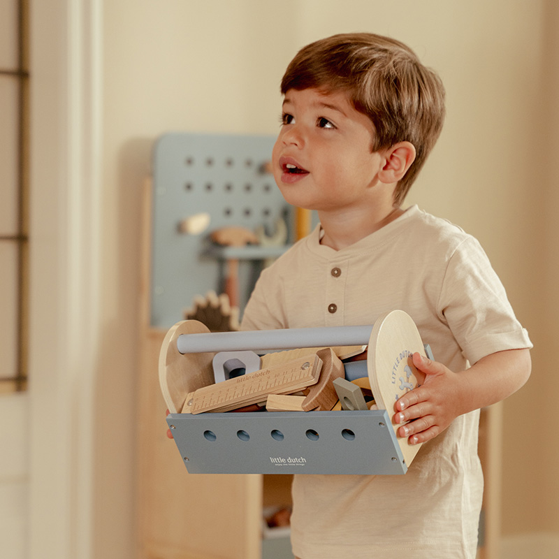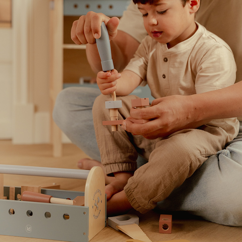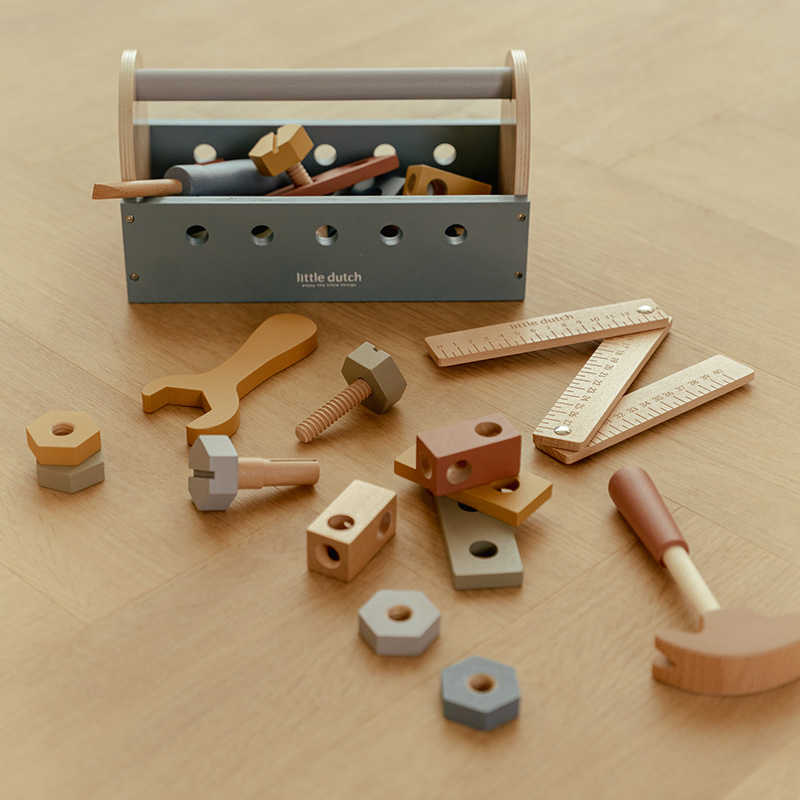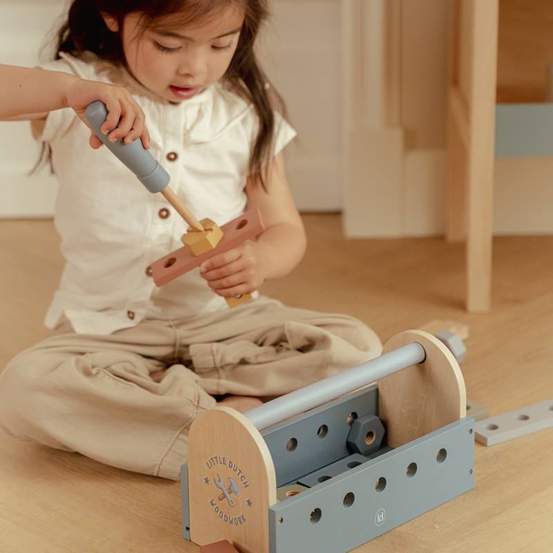Everything a little carpenter needs! This wooden toolbox includes a hammer, screwdriver, and wrench—perfect for building the most wonderful creations. But that’s not all – the sides of the box can also be used as a pounding bench! This way, little ones can hammer and screw while playfully developing their motor skills and creativity. Ready to get started?