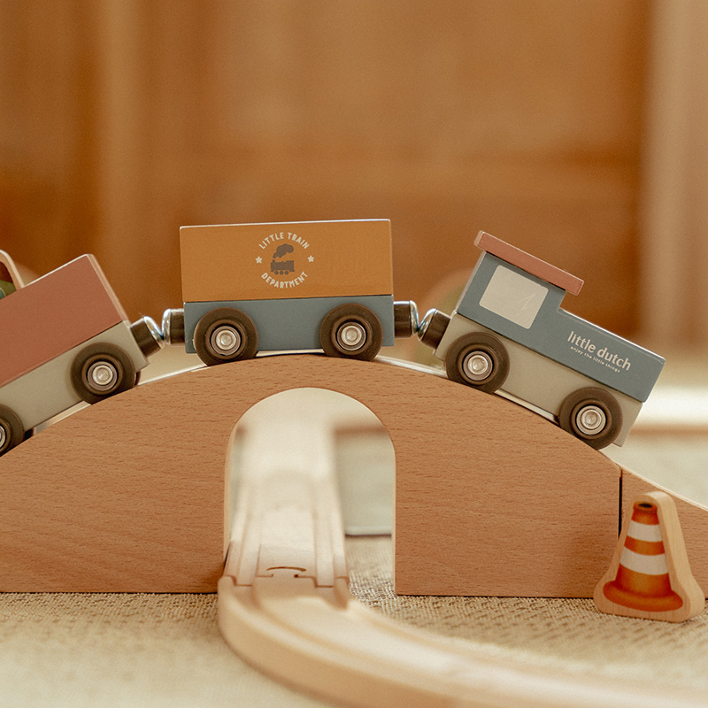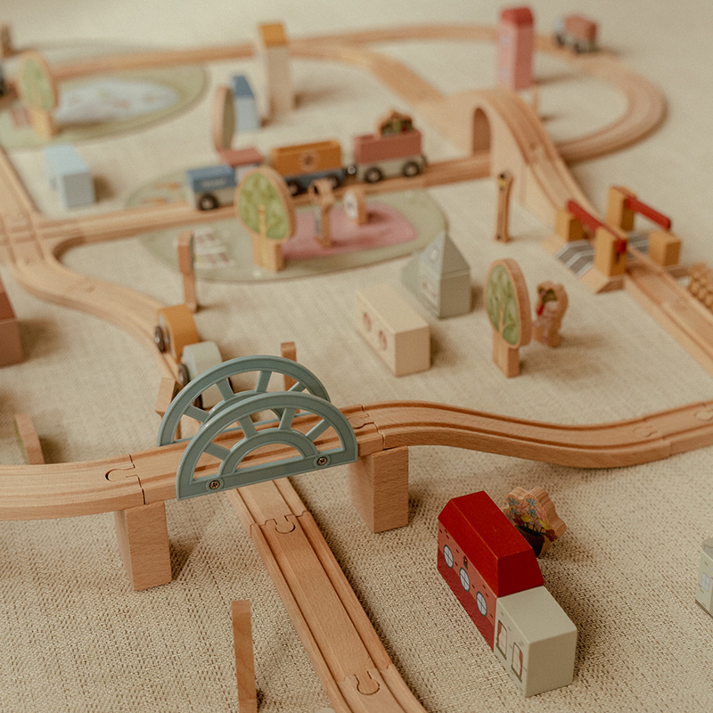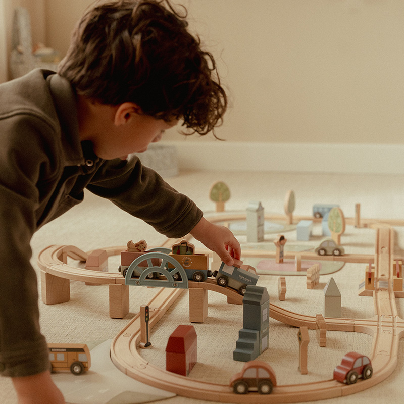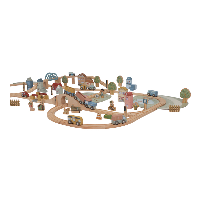 Build your own world with the Little Dutch wooden XL train set! This extensive set includes a locomotive, wagons, tracks, bridges, buildings, cars, and figures. There are also trees and traffic signs. The possibilities are endless! Drive the train over the bridge, stop at the station, and explore the city. Combine the XL train set with expansion sets to make playtime even more fun. Are you ready to hop on? 113 pcs.