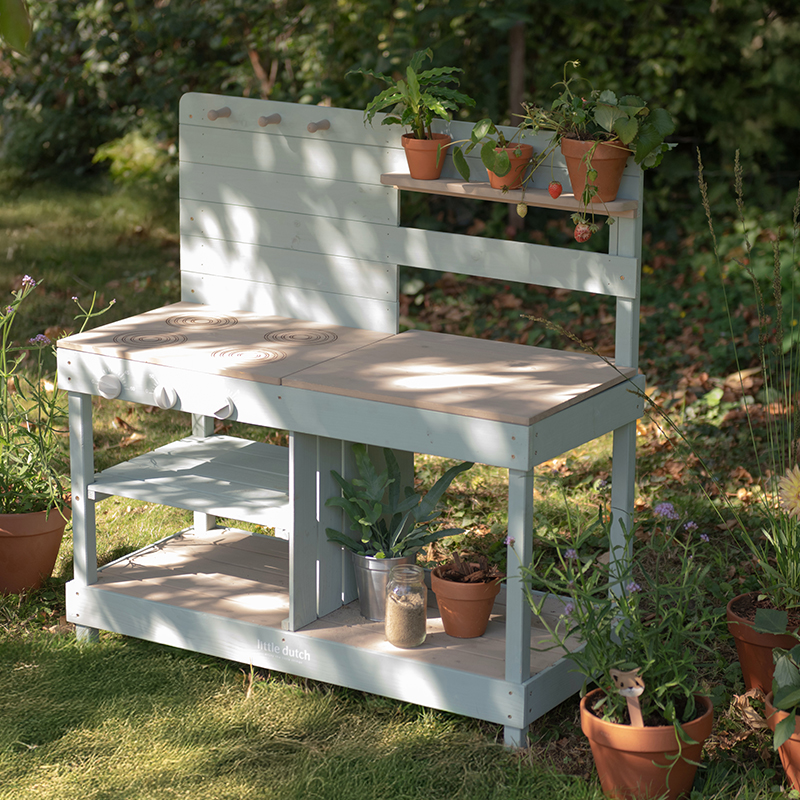 As-tu toujours rêvé d’un endroit où tu peux jouer librement avec de la boue ? Maintenant, il est là ! Découvre cette cuisine d'extérieur en bois qui ressemble à une vraie cuisinière. Soulève les planches et découvre deux grandes bacs parfaits pour t’amuser à te salir. Remplis le réservoir d’eau, prépare ta propre pâte à boue parfaite, et… c’est parti pour la cuisson ! Prêt(e) pour des heures de jeu boueux ?