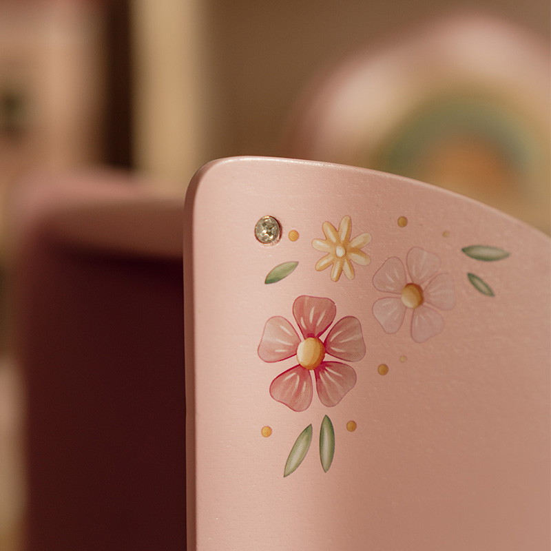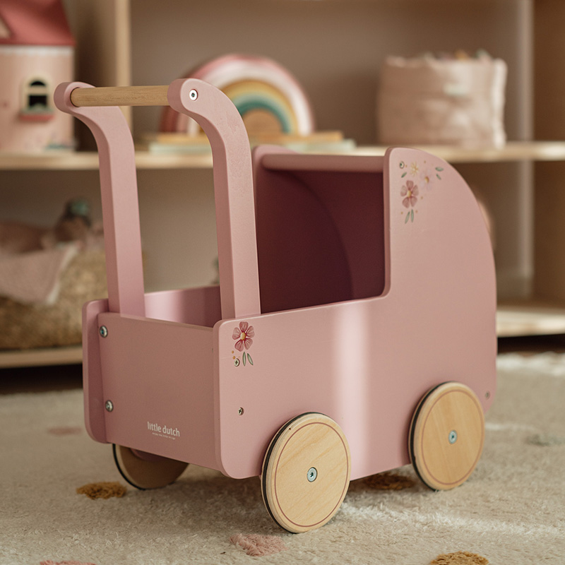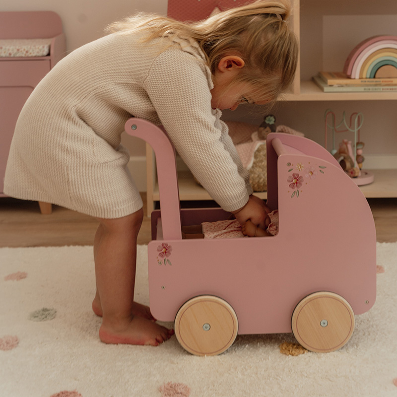 Deze prachtige houten poppenwagen heeft een nostalgisch ontwerp en is versierd met een sierlijke bloemenillustratie. De wagen wordt geleverd met een heerlijk zacht kussen, een warm dekentje en een zacht matrasje, allemaal in het geliefde Soft Flowers-dessin. Dankzij de rubberen wielen rijdt hij soepel en beschermt hij de vloer tegen krassen. Perfect voor kleine poppenouders die hun poppen in stijl willen vervoeren. Een tijdloos speelgoedstuk dat jarenlang speelplezier biedt!