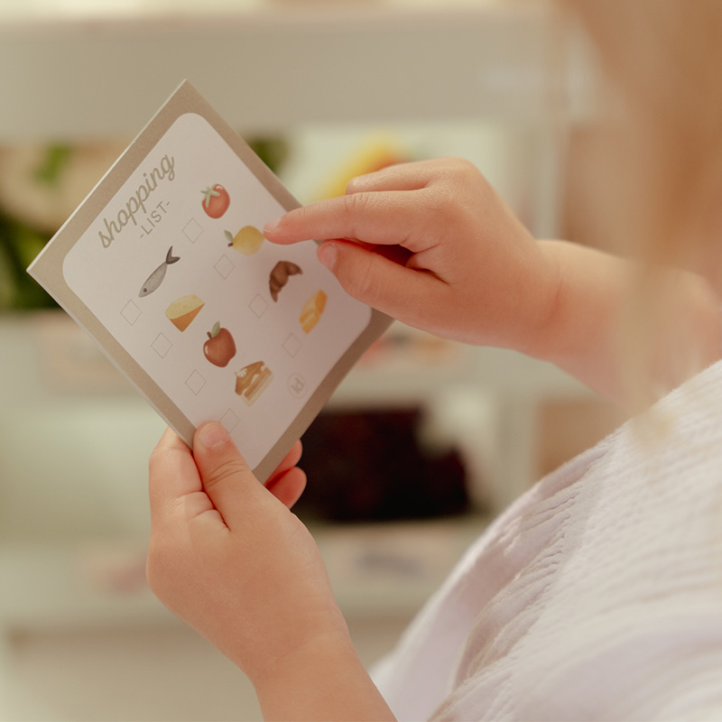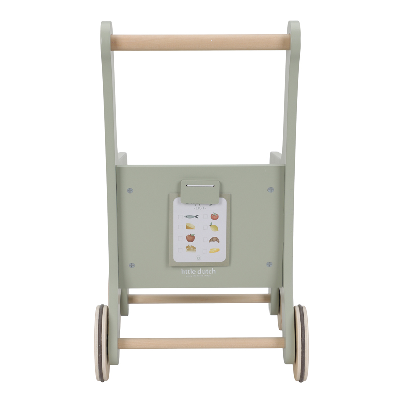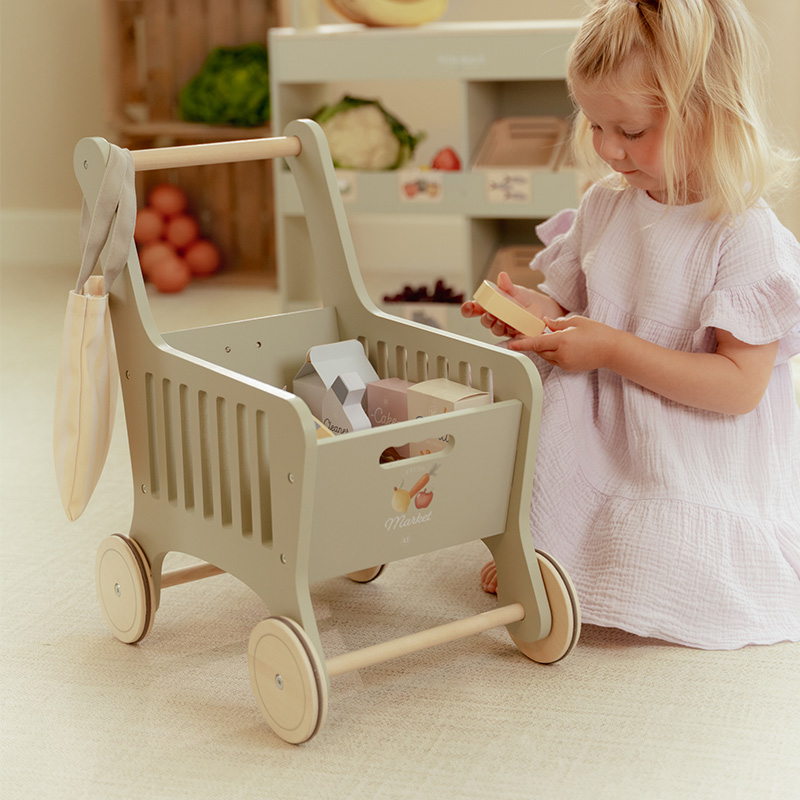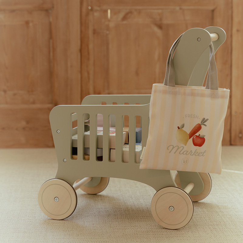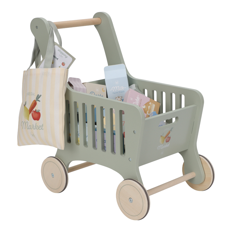 Boodschappen doen wordt een feestje! Met deze houten speelwinkelwagen haal je alles in huis wat je nodig hebt. Dankzij de ruime opbergplek passen al je boodschappen erin, zelfs als het lijstje lang is. Het houten clipje zorgt ervoor dat je boodschappenlijstje goed blijft zitten, zodat je niets vergeet. De set bevat diverse boodschappenproducten en een boodschappentas, zodat je direct aan de slag kunt. De winkelwagen is versierd met een leuke illustratie op de voorkant, wat het spelen nog leuker maakt. Wil je de ultieme winkelervaring? Combineer de winkelwagen met de marktkraam en geniet van eindeloos winkelen!