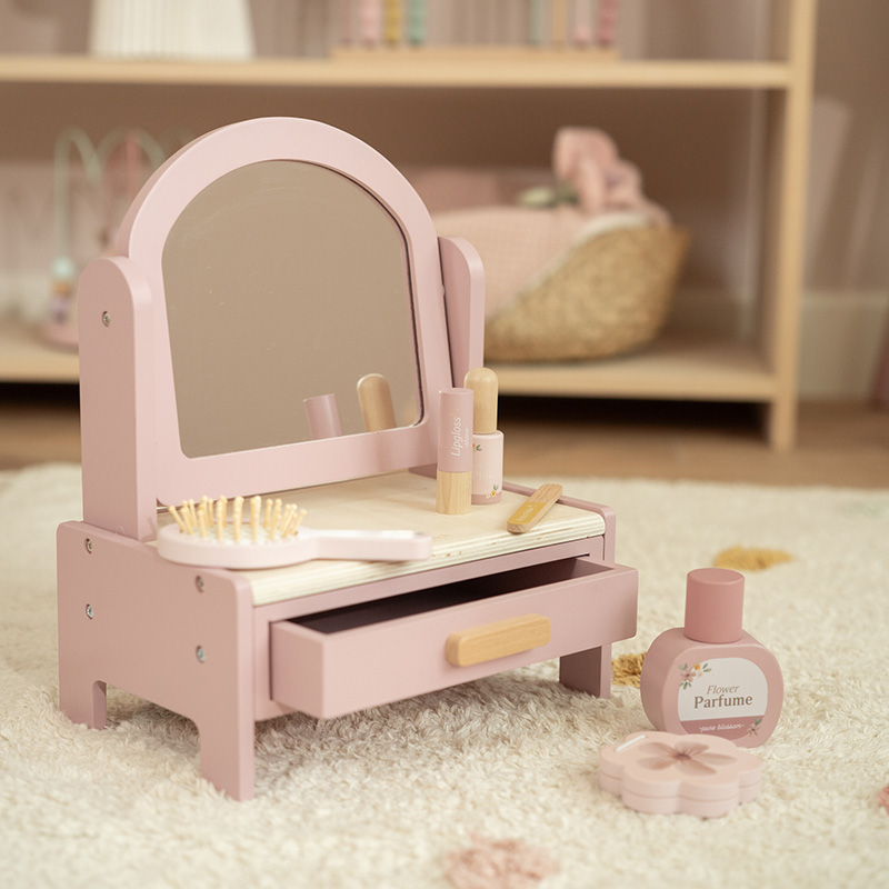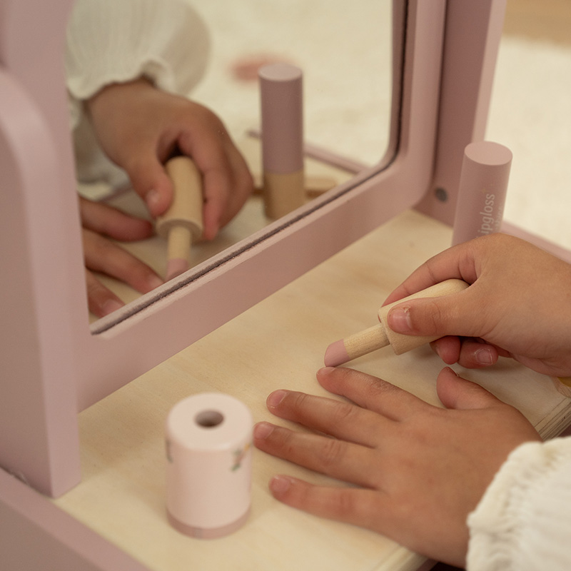 Zet je mooiste accessoires klaar en neem plaats voor de spiegel! Deze prachtige houten kaptafel heeft een draaiende spiegel en wordt geleverd met zes stijlvolle schoonheidsproducten, zoals een haarborstel, lippenstift en parfum. Perfect voor kleine beauty-liefhebbers die zich graag verkleden en tutten. Laat de fantasie maar stromen!