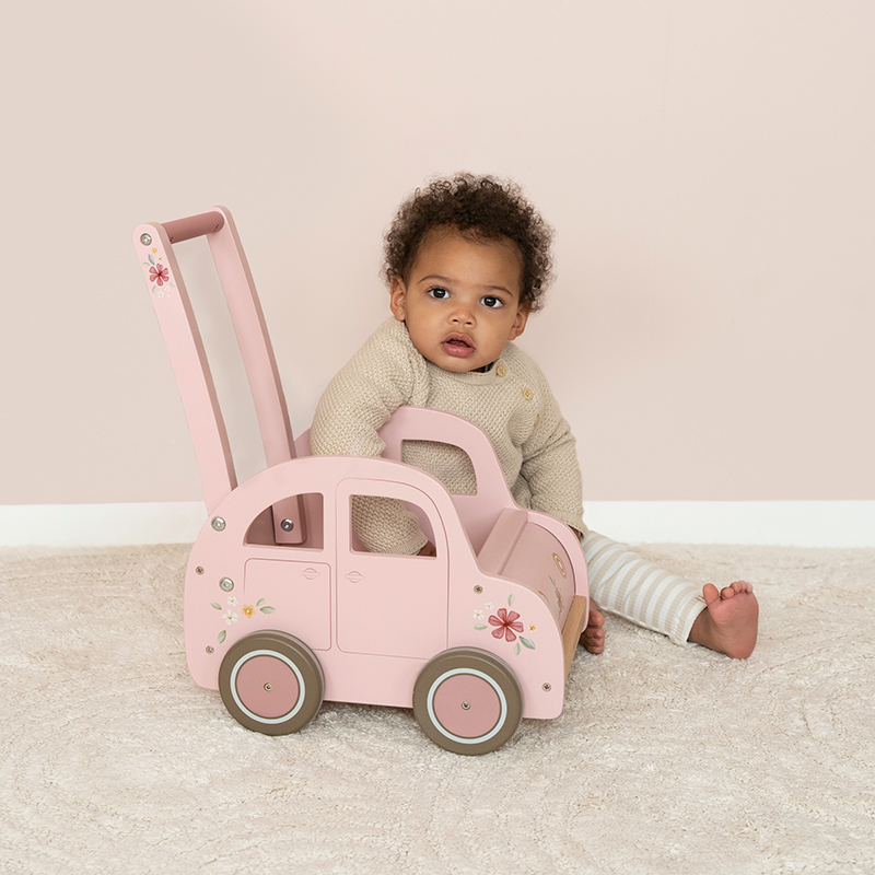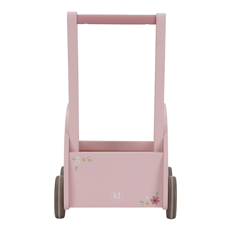 Een stijlvol ritje vol speelplezier! Deze roze houten wagen met subtiele bloemendetails en een vleugje vintage charme is perfect voor kleine avonturiers. Je kindje kan het wagentje vullen met knuffels, blokken of ander speelgoed en het zelf vooruit duwen. Zo wordt het speelgoed handig opgeborgen én meegenomen tijdens het spel. Of het nu een theekransje is met poppen of een rondje langs alle knuffels in huis – de mogelijkheden zijn eindeloos. Dankzij de rubberen strips om de wielen blijft je vloer beschermd tijdens elk ritje.